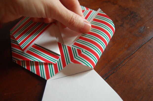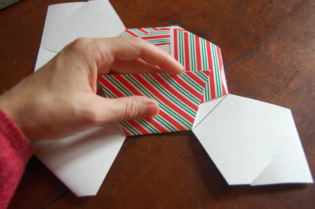 Empezar por doblar las dos esquinas que no son recortadas. Hay no hay guías en la plantilla de Navidad para esto, es bastante fácil de globo ocular. Se trata de un centímetro entre la esquina de mi redil y los cortes a ambos lados.
