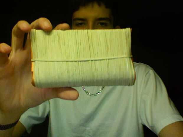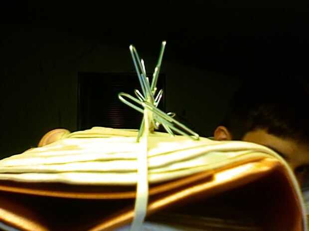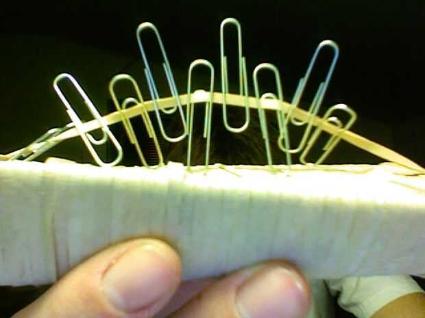 Transversal un final goma a través de los otros (perpendicular a ellos). Luego se alternan los clips de papel para que su una alta una baja, una alta, etc. (difícil de explicar. mira la foto). Luego alinee los clips para que pare y que acaba de crear un arco de clip de papel en una cinta de goma elástica y una cinta de goma envuelto de regalo PERSONAL.