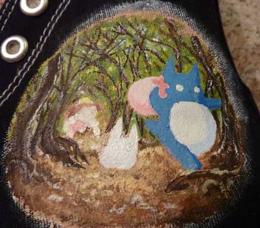 Consejo: Para los zapatos de un color más claro, puede pintar sobre los personajes principales o detalles con acrílico y luego utilizar marcadores de la tela para hacer el fondo. Este es un ejemplo de una persona que utiliza marcadores de acrílico y tela:http://robyn-hood.deviantart.com/art/My-Neighbor-Totoro-Shoe-133374812. Tenga cuidado cuando utilice marcador acrílico y tela, será mucho más difícil de encubrir errores en un zapato blanco.
