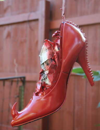 Colgar los zapatos en el aire y pintura de aerosol roja. Se necesita 3 capas. Utilice guantes para evitar limpiar pintura de las manos.