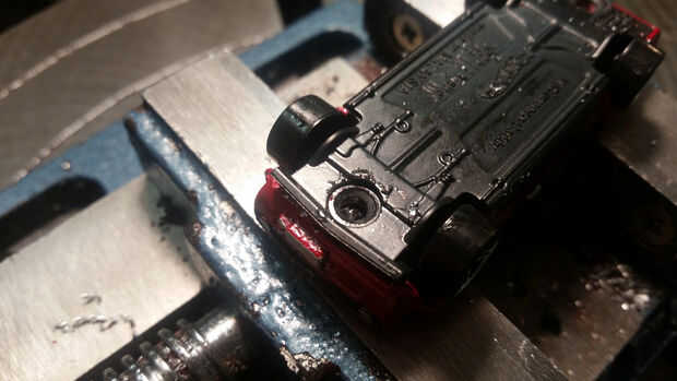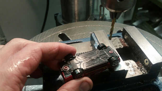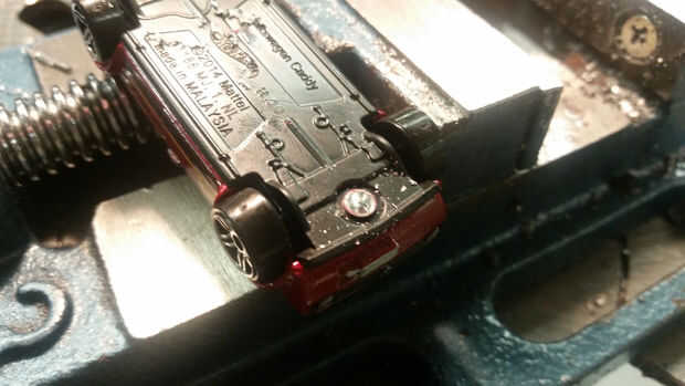 Lo primero que hay que hacer es desarmar el coche. Su bastante fácil de hacer con un taladro o una prensa del taladro. Comience con un taladro small-ish-me gusta usar una 1/8" bits. Perfore el centro de cualquier remache en la parte inferior de 1/8" profundidad. Una vez que el agujero piloto perforado, puede cortar el resto de la cabeza del remache por perforación con una broca más grande. Utilice una broca lo suficientemente grande como para cubrir toda la cabeza del remache y perfore hasta que la cabeza se ha ido.