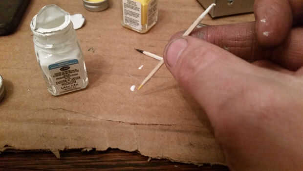 Pintura mezcla punta-usa un palillo de dientes con pintura se que puede poner las gotas de pintura en algo. Diferentes colores de la mezcla una o dos gotas a la vez para obtener el color que desee. El amarillo para los faros en este coche fue 3 gotas de blanco y uno amarillo.