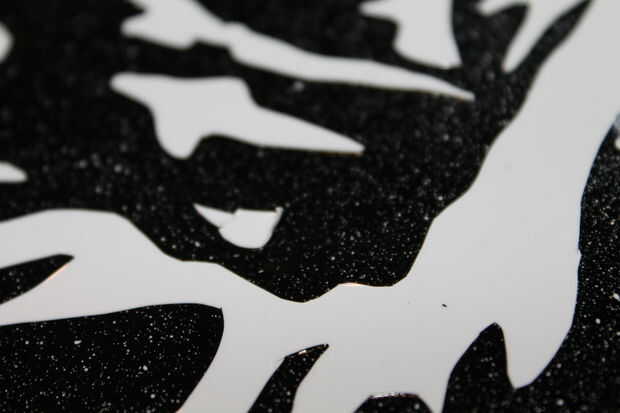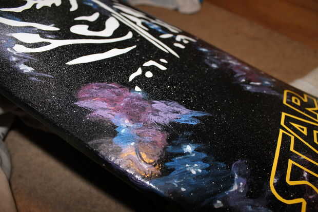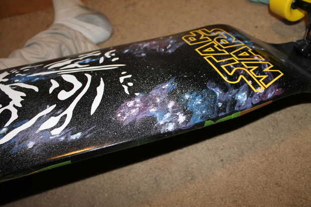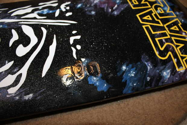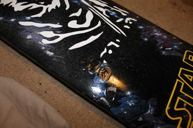 El segundo fue más difícil. Comenzó a trabajar en la etiqueta superior antes de la parte inferior estaba seca (soy un poco impaciente). También había un par de cervezas y se apresura a hacer las cosas a tiempo para el cumpleaños de la India, y me olvidé de que la parte inferior no estaba seco... Agarré el borde de la patineta y la pintura ablandada aplastado hacia fuera alrededor de mis dedos!