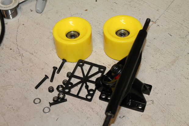 En primer lugar, quite todo el hardware, los camiones y las ruedas y puso a un lado (en una caja o bolsa para no perder las piezas). No tomar una foto de ella, pero ya que iba a pintar los camiones también puse cinta de pintor sobre los hilos y los asientos de la rueda por lo que habría problemas al volver a armarlo.