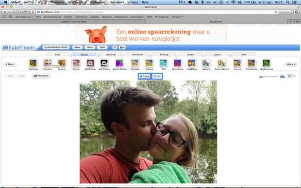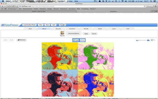 Así que lo que tienes que lograr es una foto simplificada que consisten de 2, máximo 3 tipos de color. Ejemplos encontramos en cuadros de arte pop (piensa en Marilyn Monroe o). Así que para el primer paso en la simplificación de la foto he usado un editor de imágenes online que convierte imágenes en arte pop. He utilizado FotoFlexer.