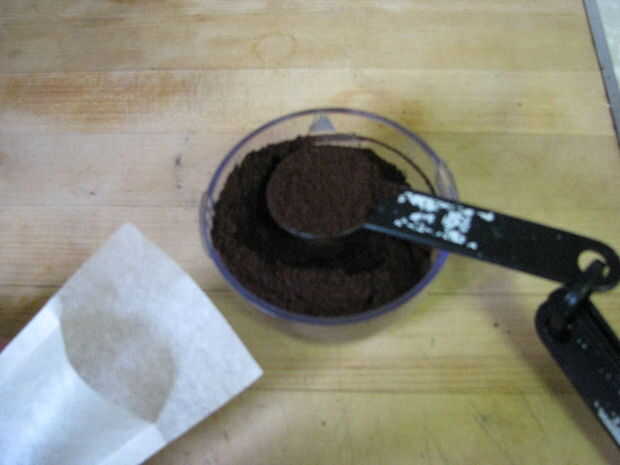 Añadir el café a una bolsa de té.  Usar cucharas de mesa tres para una oscura taza de café.  Mi "Copa" de café es más cercano a 2 c. de agua.
