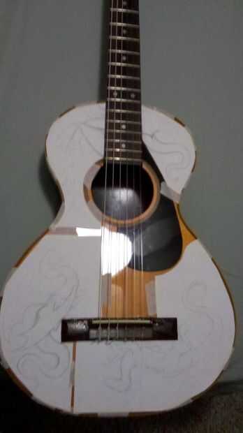 La forma de las grietas fueron tipo de me hizo pensar de criaturas o algo arrastrándose alrededor de la guitarra así que "Fui con eso" y las criaturas se convirtieron en Dragones, y el esbozo áspero llevo a cabo.