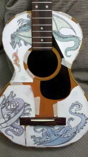 una forma creativa de utilizar su guitarra como un lienzo. Compré varios "archtop" de algunas casas de empeño y volvió bajo ukes, madolins y muchas cosas más. Son infinitas las cosas que puede hacer con Modge podge.Se necesita:Guitarra (Duh)Tije