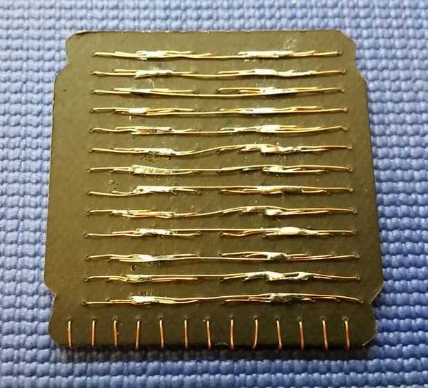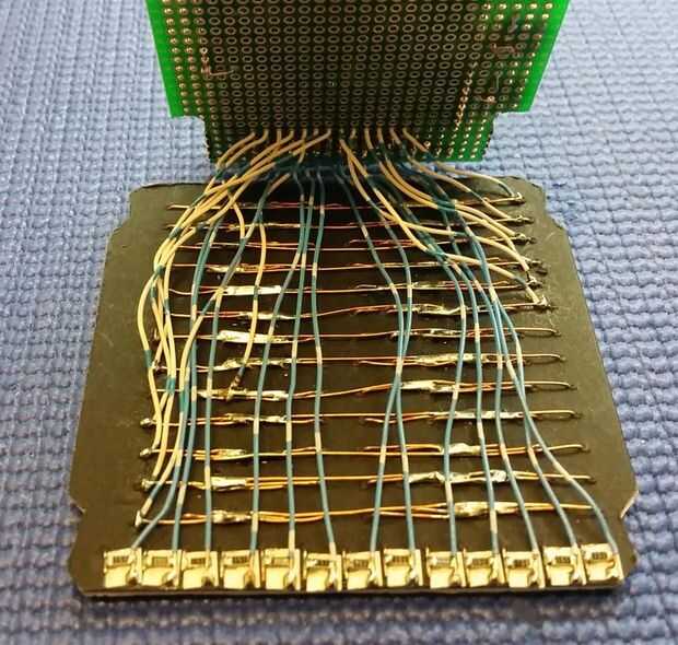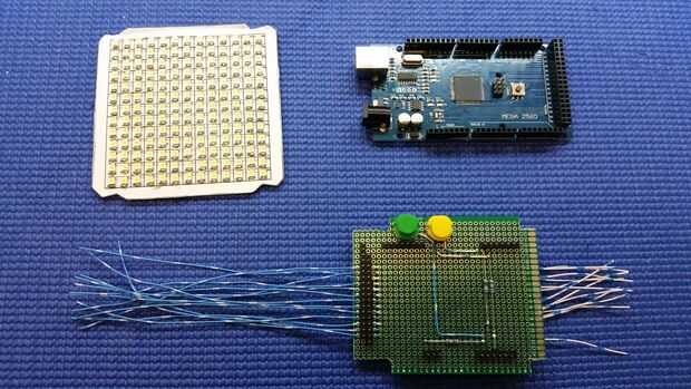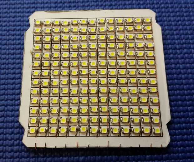 En el ejemplo utilicé alta intensidad superficie blanca monta LEDs que corté de una tira de LED de 3v. Únete al lado del ánodo (+ ve) de cada LED en cada columna vertical en un lado de la cartulina. Luego pasar el cátodo (-ve) a través al otro lado de la cartulina a través de un agujero y unir cada fila juntos por ese lado. Lo que usted termina con es 13 tiras de ánodo en el lado LED verticalmente y cátodo 13 tiras al otro lado horizontalmente. Éstos entonces están conectados al escudo Arduino del paso anterior según el diagrama del circuito.