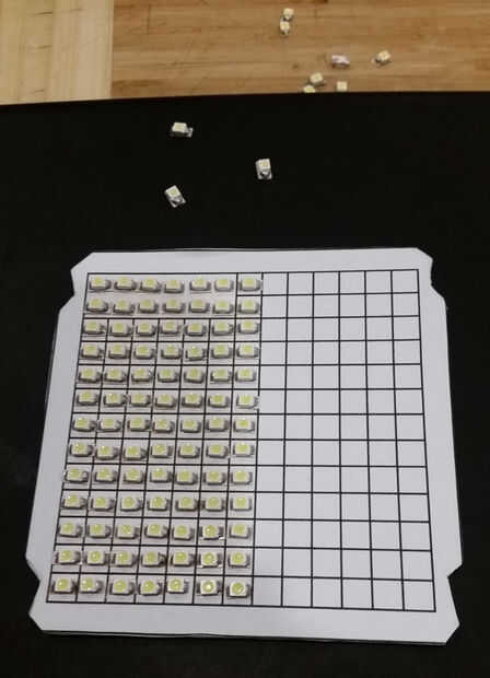 Utilice el archivo de plantilla de hoja de cálculo adjunta para crear 7,5 cm x7.5cm rejilla para colocar los LEDs en el tablero de exhibición. Adjunta es una plantilla que puede modificar e imprimir luego pegada sobre la cartulina.