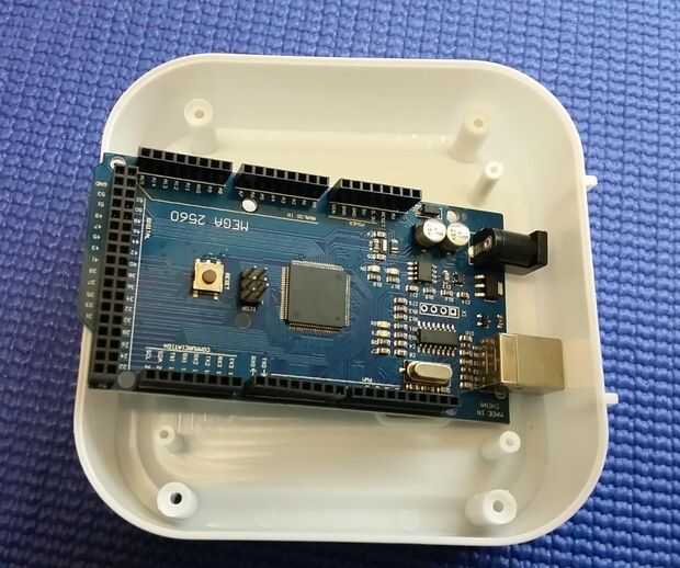 Colocar los componentes y planificar cuidadosamente el montaje de la placa Arduino, el escudo, botones y PCB de RTC. Asegúrese de que la placa Arduino se puede acceder externamente para programación con fines así como la toma de corriente externa. Para ello, asegurando que la toma de alimentación de Arduino y el puerto serial están cerca del borde del caso. En mi caso orientado el Arduino Serial y Puerto sobresale a través de la base de la caja del reloj. Caliente pegué en pies de plástico para elevar el reloj lo suficiente como para proporcionar espacio y estabilidad al sentarse en una mesa.