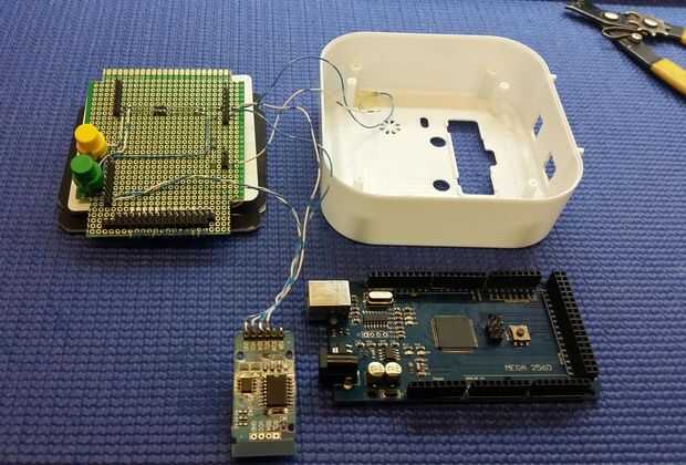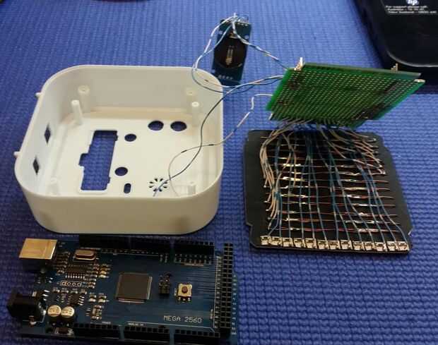 Utilice el cable de conexión para conectar el Arduino PCB, botones y RTC en el escudo según el diagrama. Jugar a especial atención a los cables y la posición de los componentes para asegurarse de que son perfectamente apto y segura en el caso.