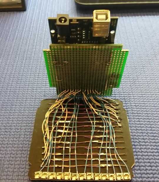 Con el fin de evitar la complejidad y tiempo requerido para poner controladores de LED en el circuito he usado un Arduino Mega para manejar una matriz de 13 x 13 de LEDs. El Arduino lee el tiempo RTC y luego dibuja la pantalla por encender un LED a la vez. Lo hace abordando cada LED sistemáticamente con X, Y coordenadas. Los LEDs están protegidos por resistencias de 150 Ohm y que sólo se activan individualmente significa la corriente es limitada.