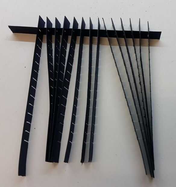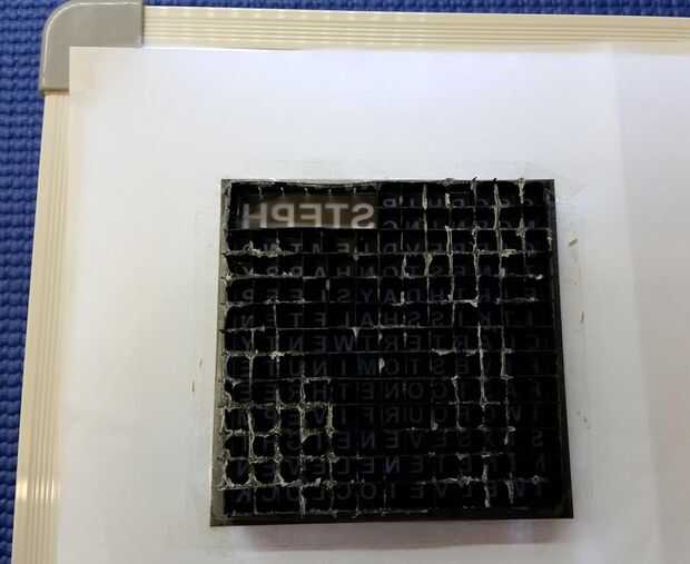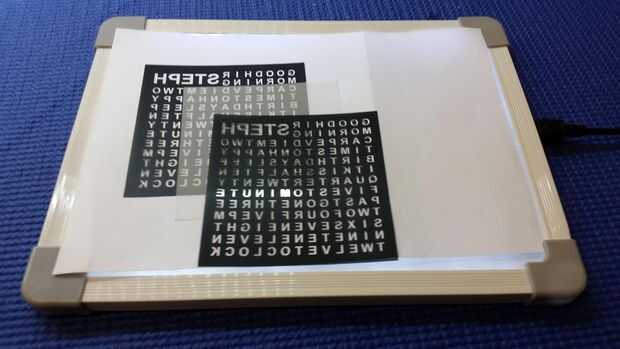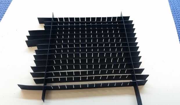 Desmontamos cuidadosamente el paquete y sistemáticamente los deflectores según las imágenes. Ajuste el ancho de los deflectores para caber en la caja y asegurar que haya suficiente espacio libre en todos los lados. De las celdas de texto de nombre quitar los deflectores según el cuadro para asegurar que no son visibles cuando se ilumina detrás el nombre del texto.
