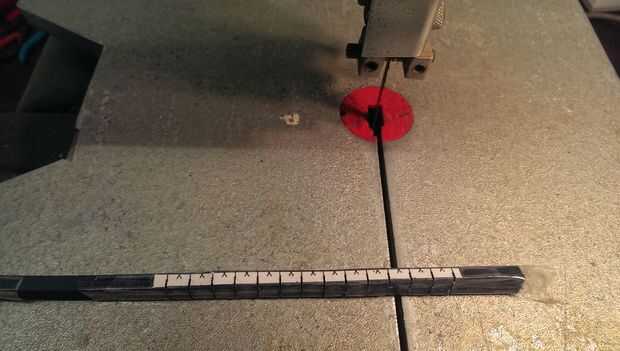 Usando una sierra de cinta o un arco de sierra Junior corta el paquete 50% a través de la marca según el diagrama.