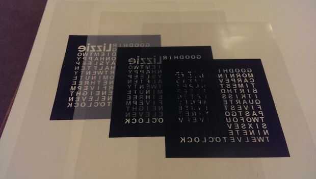Usando la plantilla de modificar el texto según sea necesario y haz tres transparencias negro impresos con el tamaño correcto. Obtenerlos impresos al revés para que al presionar contra el vidrio al lado de toner es hacia el vidrio. Esto le da un negro más profundo en la pantalla frontal. Fui a una tienda de impresión local y había hecho esto en una de sus impresoras láser en color que cuestan menos de $4. Mi consejo es conseguir cerca de 9 copias en caso de daño o cometer errores al cortar.