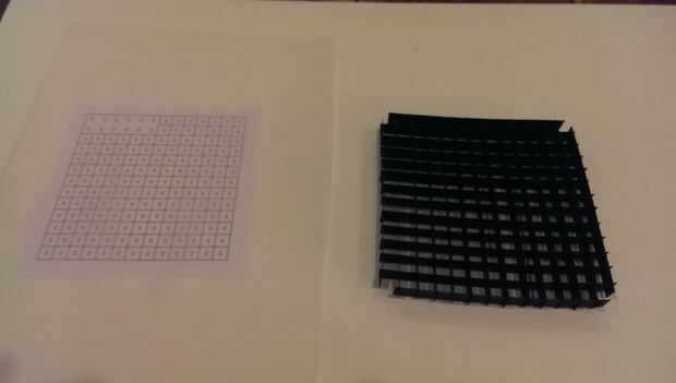 Los deflectores se pegan directamente sobre una hoja A4 de papel de calcar sobre una plantilla. Utiliza pegamento de epoxi cinco minutos dos parte. Borrón de transferencia en los bordes del bafle y mantener en su lugar sobre el papel hasta que se seque el pegamento. Esto asegura que los deflectores son rígidos y asegura que no hay escape de luz entre cada celda cuando un LED se enciende.