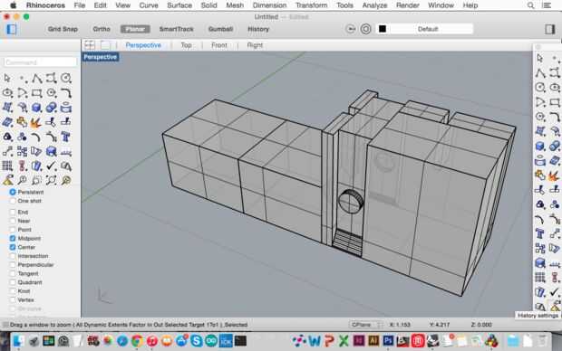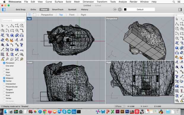 Utilizando los cuatro vistas, arrastre la forma que usted sólo importados que intersecta con el modelo 3D donde los mecánicos necesitan recortar. La parte más alta de su modelo debe ser dentro de la cabeza, asegurándose de que está lejos de la parte delantera para que las esquinas superiores no empujar hacia fuera en todos. Debe meter el lado más corto de la forma de la parte posterior de su modelo 3D. Asegúrese de que la forma se encuentra bastante del centro en la cabeza así. Alineación en la parte inferior, mueva la forma hacia abajo por lo que se sobresale un poco en la parte inferior. Si la forma es totalmente al ras con la parte inferior, Rhino puede conseguir confuso por lo tanto, la forma no se conseguir cortar correctamente.