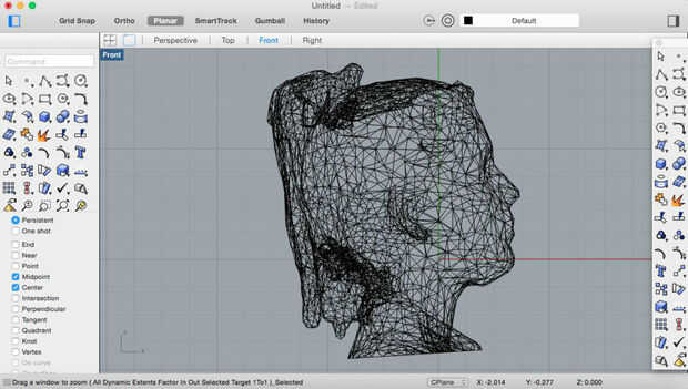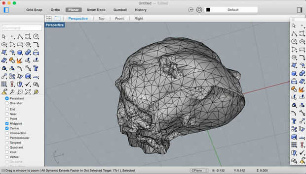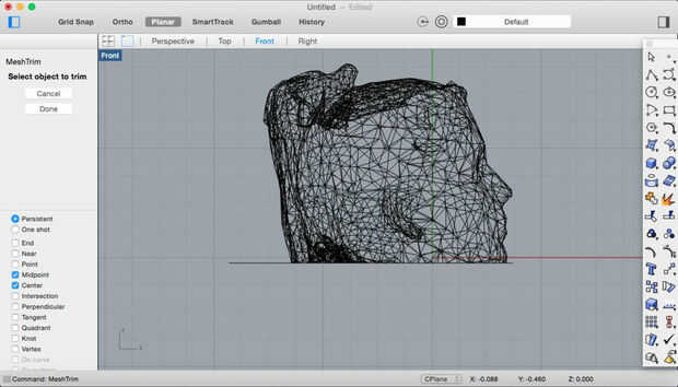 Una vez que se gira el modelo, utilizando el comando Line , dibuje una línea donde desea recortar por debajo. Utilice el comando MeshTrimy cuando se le pida a 'Seleccione objeto de corte ', seleccione la línea que trazaste y cuando se le pida a 'objeto select para recortar ' Seleccione su modelo 3D haciendo clic en él en cualquier lugar bajo su línea.