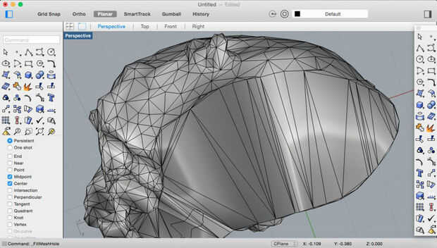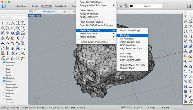 Consejo #1 : Será muy tentador usar "Llenar todos los agujeros" en vez de "llenar agujeros". Evite hacerlo, porque confunde Rhino. Al llenar los agujeros múltiples en una malla en el mismo plano, Rhino tiene problemas para reconocer qué borde es el límite de ciertos agujeros y usted es más propenso a errores.