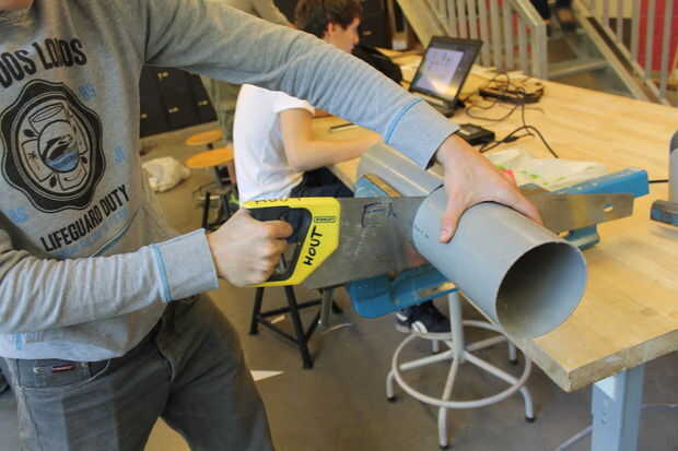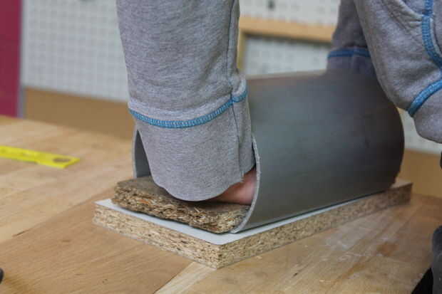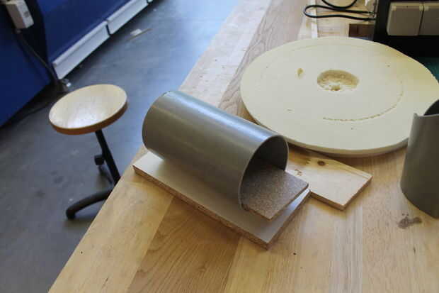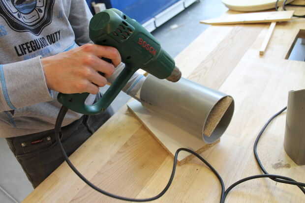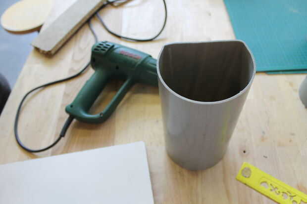 Partir de un tubo estándar de PVC con un diámetro interno de 12 cm. cortar a una longitud de 22 cm. Luego tomar un soplador de aire caliente para calentar el tubo por lo que fácilmente puede ser deformido. Luego aplicar una plancha de madera con dimensiones 10 cm x 30 cm y colocar en el tubo de PVC. Aplicar presión hasta la parte posterior del tubo se aplana.