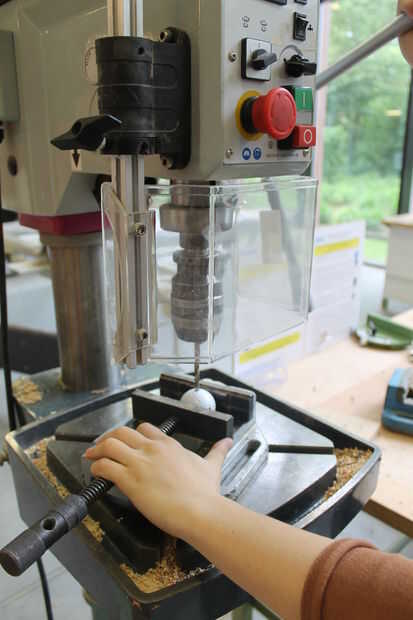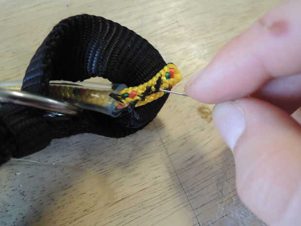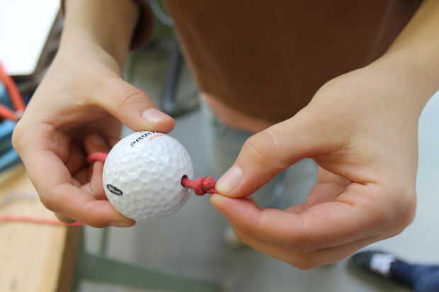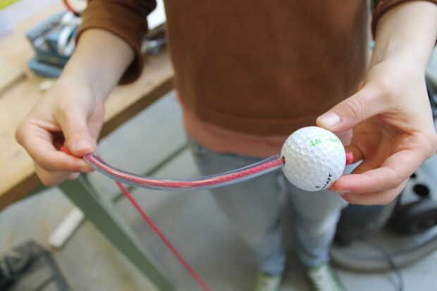 En primer lugar, la bola que se unirá al collar necesita un agujero a través del cual se puede poner una cuerda. La cuerda tiene una longitud de 15 cm, pero esta dimensión puede variar de perro a perro. Hacer un nudo firme en el extremo de la cuerda para fijar la cuerda a la bola. Luego aplicar un pequeño tubo de PVC para proteger el en cuerda para evitar que se tuerza y la armadura cuando el perro quiere agarrar. Es importante que el cable está conectado firmemente al collar. Hemos cosido la cuerda en el collar de tela.
