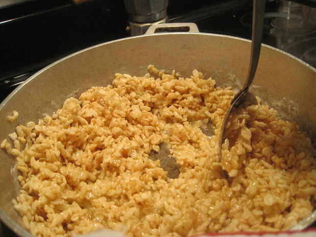 De la mezcla de cereal de arroz Krispies. Revuelva hasta que estén bien cubiertas.