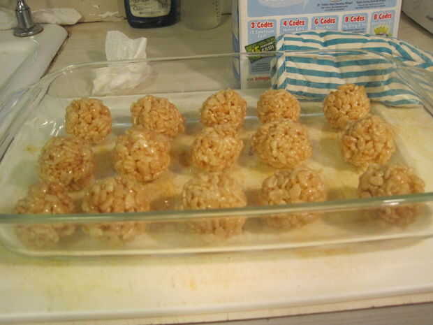 Las manos húmedas y molde cereales en bolas. Poner cereales dulces en bandeja. Espere a que trata de cereal a endurecerse para alrededor de una hora si quieres que sea más fácil de decorar. Palos en bolas de cereal de arroz Krispies de la puntura.
