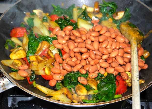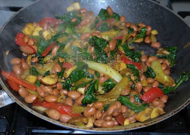 Tomar una sartén antiadherente grande y calor en el calor más alto. Cuando esté caliente, añadir algunas lloviznas de eso aceite frutado. Ahora, Agregue ajo picado, pimiento rojo y las tiras de witloof. Revuelva a menudo. Añadir 8 sonrisas de pimienta negra y unas pizcas de sal marina. Revuelva a menudo. Después de 5 minutos o menos, añadir su corte encima champiñones y revuelva todo ronda en el pan. Añadir 1/2 cucharadita de ras-el-hanout y freír más. Cuando tus setas casi tierna y dorada, añadir sus hojas de espinacas y doblarlas en la mezcla de verduras. después de 1 minuto, añadir tus frijoles. Revuelva todo ronda en la sartén y calentar sus frijoles. Por último, agregar la otra 1/2 cucharadita de ras-el-hanout y compruebe su condimento una última vez. He añadido unas pizcas de sonrisas de sal y 10 de mar de pimienta negra. ¡ Tiene sabor picante y aromático, no blandos! ;)