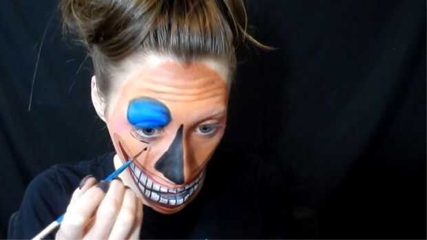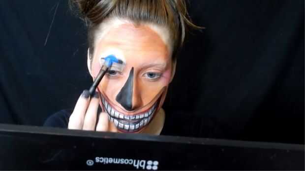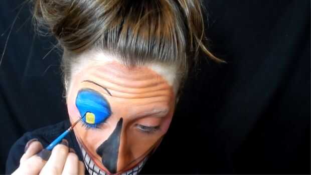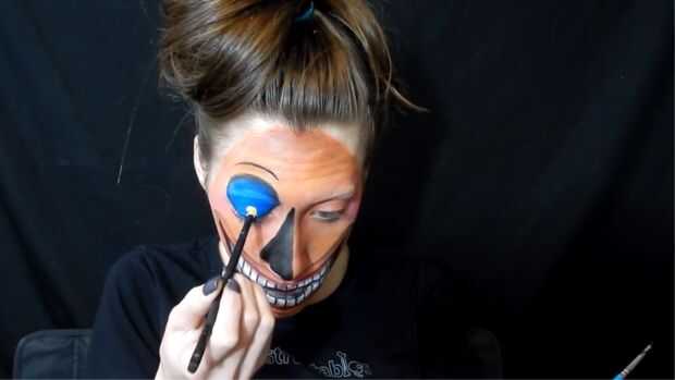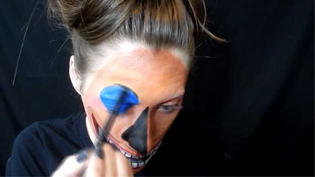 Usé pantalón azul cuerpo de mehron para llenar el ojo, luego he utilizado sombra de ojos negro para ir alrededor del ojo y sombra un poco en el ojo, luego tomé la pintura de cuerpo negro y añade las líneas alrededor de los ojos, luego usé pintura de cuerpo amarilla para añadir a la pupila amarilla y describí en negro.
