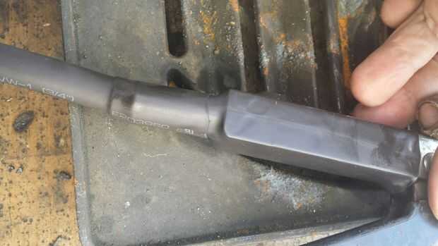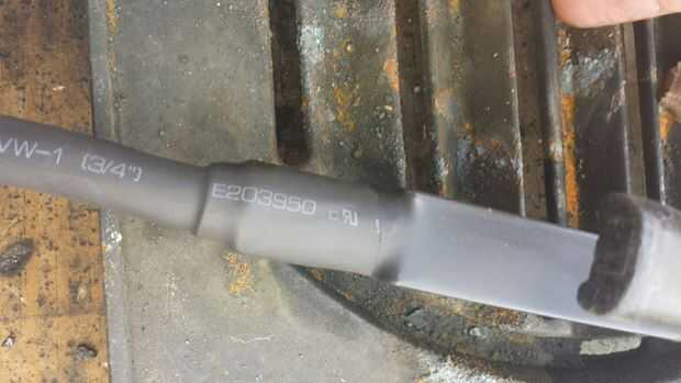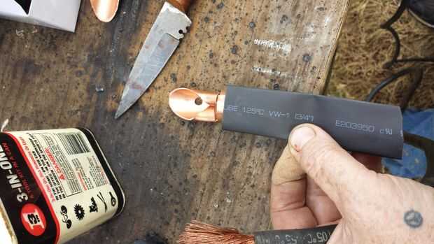 He utilizado dos trozos de contracción de la tubería; 1" y 3/4" pieza, cada uno de aproximadamente cinco pulgadas de largo. La pieza de una pulgada caben sobre la mitad posterior de la espina pero no encogerá abajo pequeño suficiente para morder el cable por lo tanto de la soldadura de 1/0 3/4" pieza. Entonces uno fue escondido debajo de la otra antes de calentar el pedazo más pequeño de la tubería del encogimiento. Esta parte salió muy bonita y casi parece una lástima estar tapada!