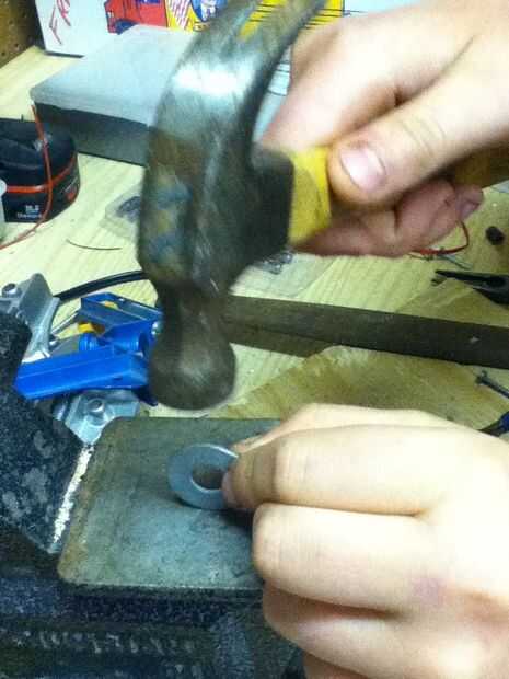 Inicio gira la lavadora en su borde. Al mismo tiempo, aprovechar la lavadora en su borde con un martillo.