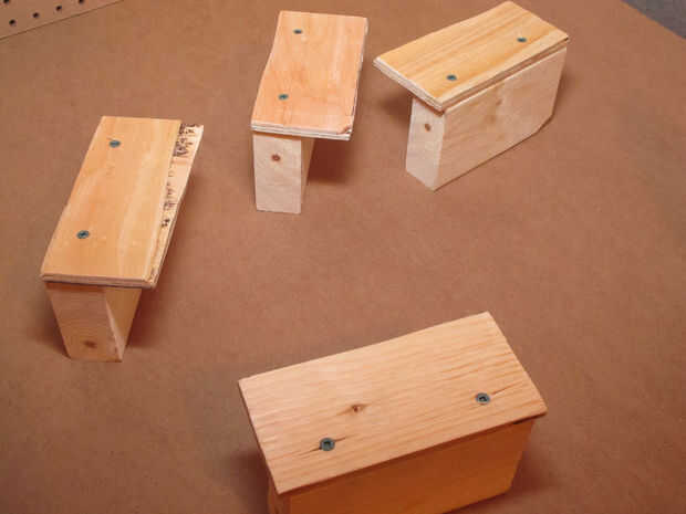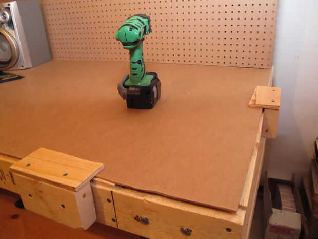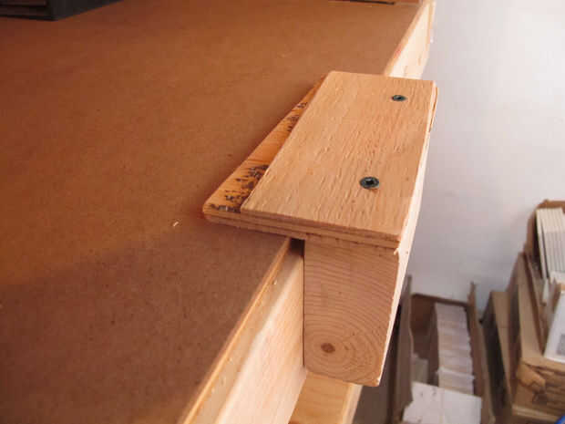 sabía que la superficie de trabajo de la madera no duraría para siempre, así que quería tener la capacidad de reemplazar cada vez que la superficie se convirtió en demasiado marcada para llevar. Para facilitar esto tomé unos trozos de contrachapado desechos desechos 2 x 4 y hecho abrazaderas removibles para ser usado en cada uno de los laterales y el borde frontal del Banco. Esto me permitirá quitar las pinzas y reemplazar la tabla en cualquier momento.