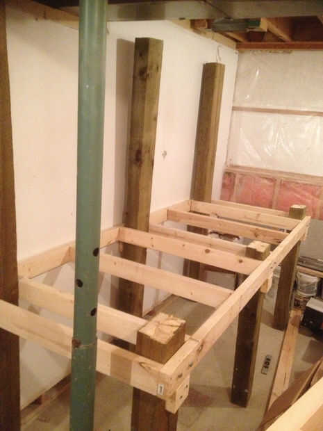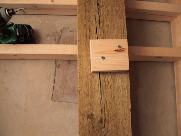Después de cortar seis 6 cuadrados 4" bloques de mi final corta de 2 x 4, supe que mi altura final deseada era una altura de trabajo de 38", así que calculé la distancia abajo desde allí para tener en cuenta el espesor de 2 x 4, tablero de aglomerado y madera contrachapada. En este caso ese espesor llegó a un total de 4 1/8". Así que desde la base de cada poste mide hasta 33 7/8" y había marcado con un borde recto. Luego tomó la Plaza cortes de 2 x 4 y había usado como un soporte de soporte provisorio para el estante superior. Entonces comencé por un lado y comenzó a perforar a través de los correos, y estante, asegurando la superficie era nivel durante todo el proceso haciendo pequeños ajustes verticales como me mudé de post a post.