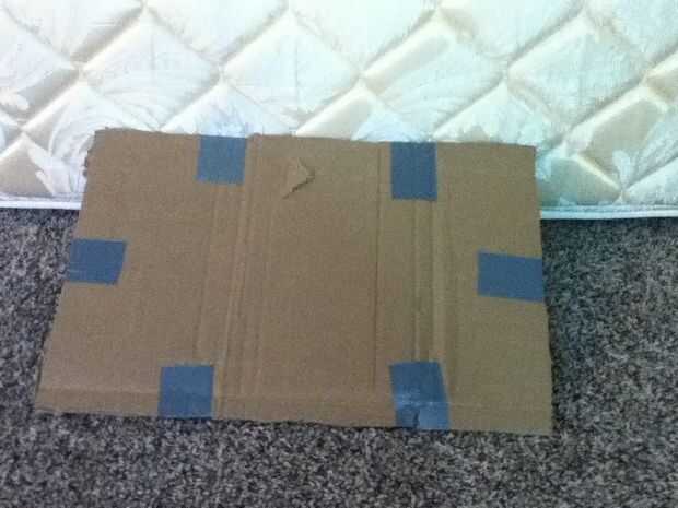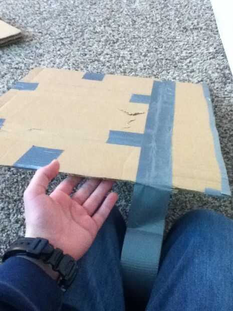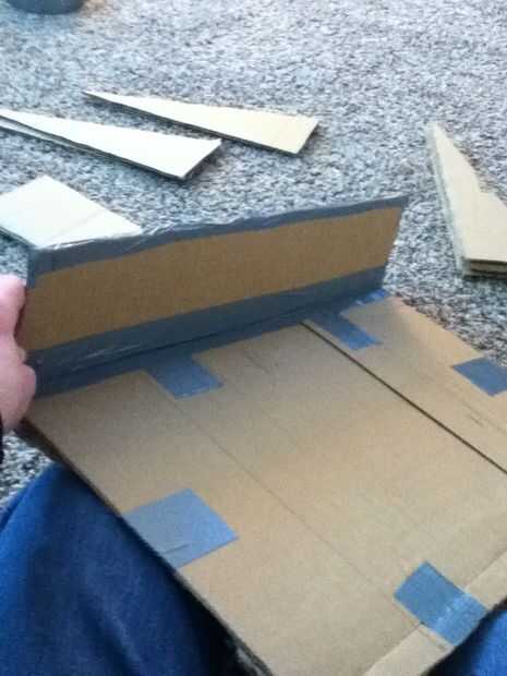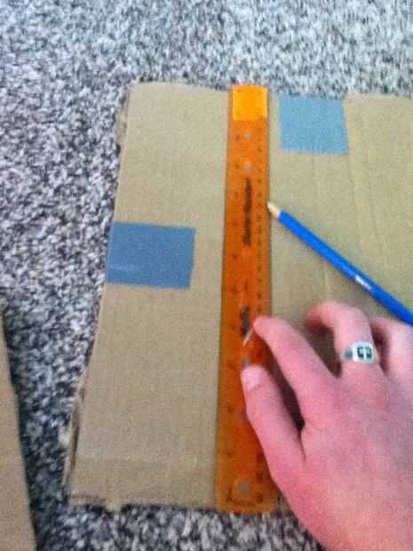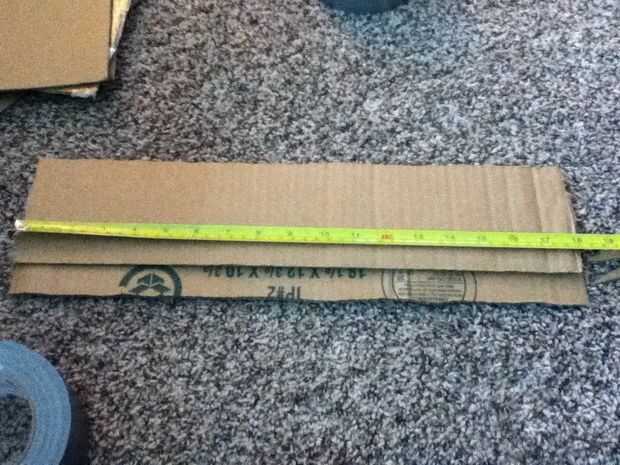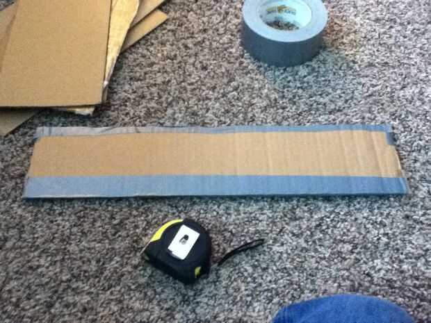En primer lugar, tomar dos hojas de 12 "x 18" y con cinta adhesiva. Asegúrese de que no se solapan cualquier pliegues, porque si tienen la pieza se dobla más fácilmente en ese punto. Ahora hacer dos líneas de arriba hacia abajo de esa pieza que son cuatro pulgadas a los lados (ver foto). Luego de su tira de diez pies, tomar tres pies y doble sobre una pieza que es 4 "x 18" y péguela con cinta adhesiva como se muestra en la imagen. Luego cinta adhesiva en la parte superior de la slab(see picture) 12 "x 18".