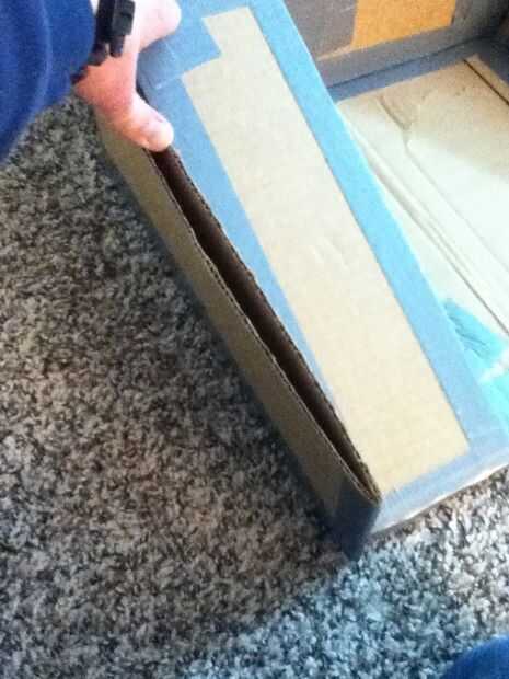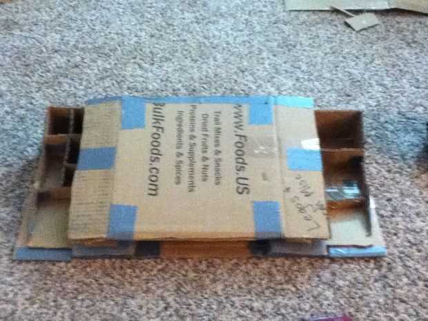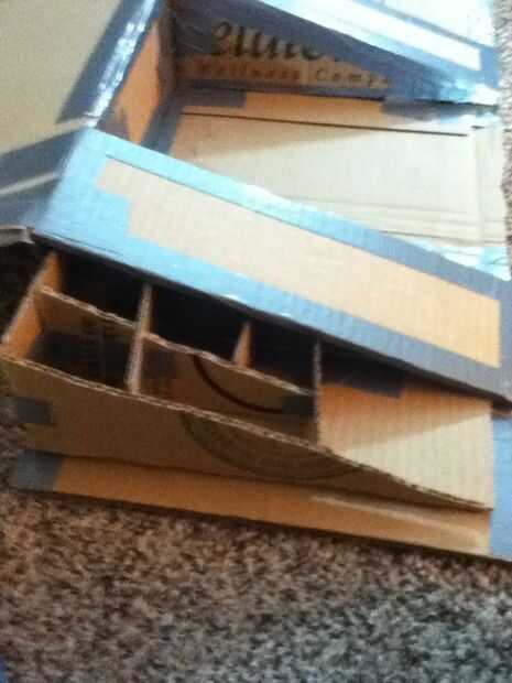 Ahora toma los últimos triángulos y acortar. Luego con cinta adhesiva a los exteriores de los cajones. Corte un espacio de mango en el outsides(see picture). Ahora debe ser capaz de empujar los cajones en los casos de cajón y cerrar la tapa exterior. Cuando está todo abierto en debería verse como la última foto.