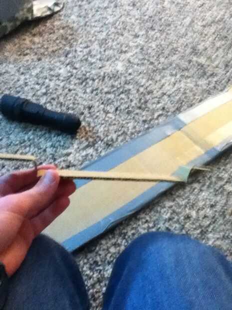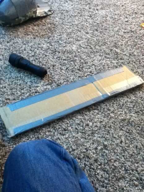 Ahora puede tomar la última parte de los diez pies de cartón y doble sobre y cinta juntos, hacer una pieza que es 4 "x 18". Ahora toma un trozo de cartón y cortar una pieza que es más o menos 1 "x 10". Es la curva se parece a la imagen. Ahora la cinta firmemente sobre la 4 "x 18" pieza. Uso un montón de cinta, como el maletín y todo lo que colgar en esto. Añadir la última ficha ya a un lado. La cinta el lado sin una ficha firmemente sobre la base de la case(see picture) breve. Ahora inserte la lengüeta en el orificio en la parte superior de la parte posterior de la workspace(see picture).
