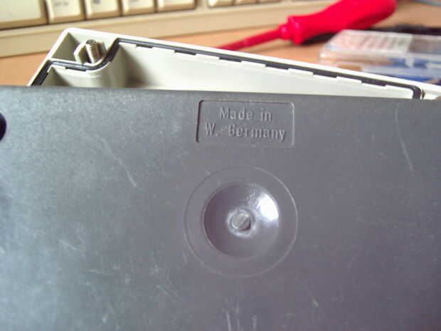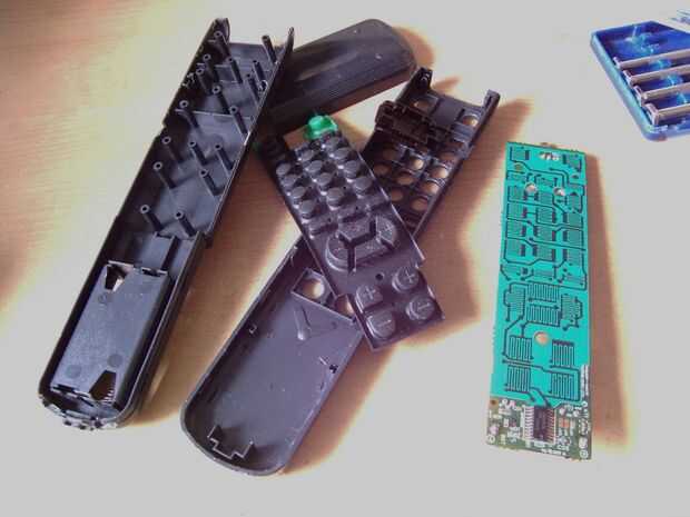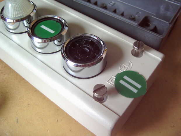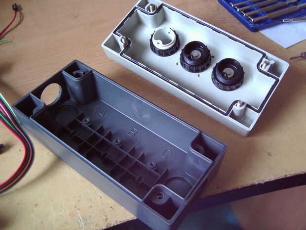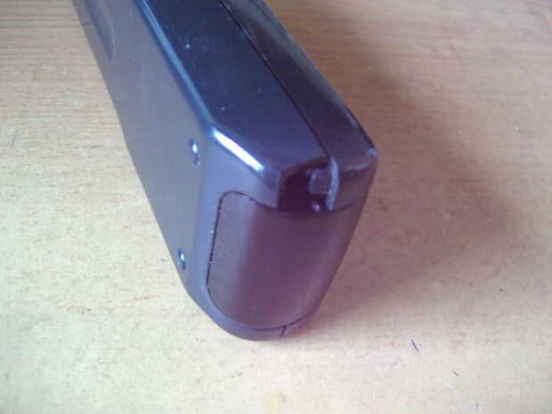 Mientras disimulo el control remoto industrial, noté que faltaban los interruptores actuales. También la toma superior se utilizó originalmente para una pequeña bombilla. La mayoría de la parte de la superficie inferior del remoto "ladrillo" tuvo que ser quitado con una herramienta dremel.