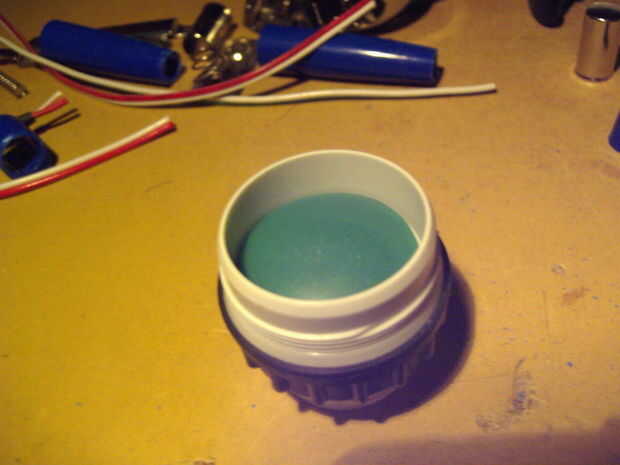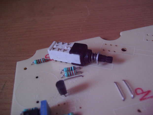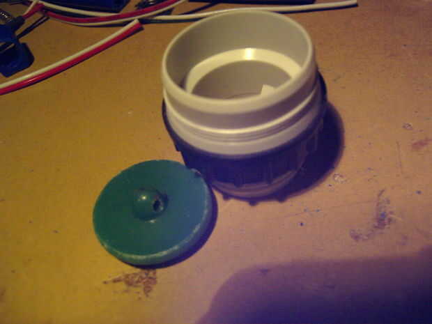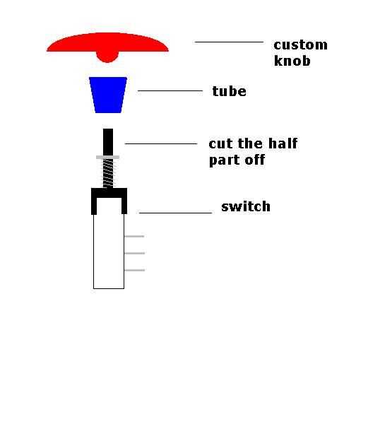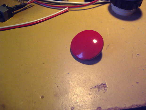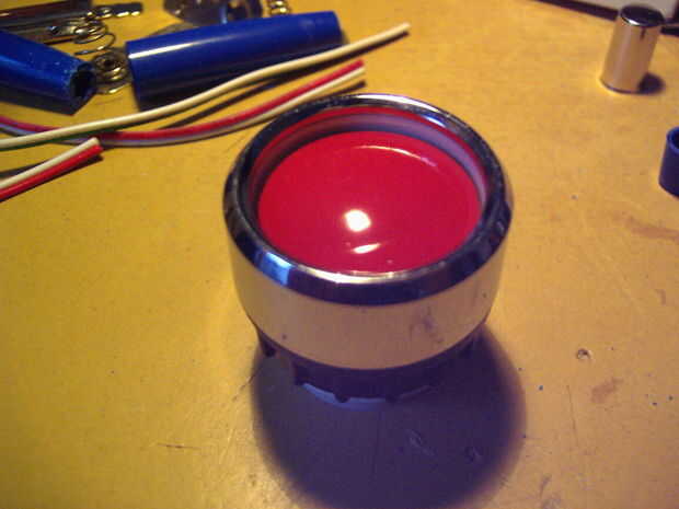 decidí usar el casquillo de bombilla de luz para mi botón personalizado hecho. Para el mando de tomé un botón de un suéter viejo, que fácilmente podría caber dentro de la toma y pintado en barniz rojo. El interruptor con la primavera vino de viejas piezas de pcb. Ambas piezas, el interruptor y el mando tuvieron que ser estabilizado con un pequeño tubo en el medio y pegan juntos. Para fijarlo a la toma utilicé algunos casquillos de montaje de carcasas de PC vieja. un pequeño tornillo y un montón de pegamento caliente.