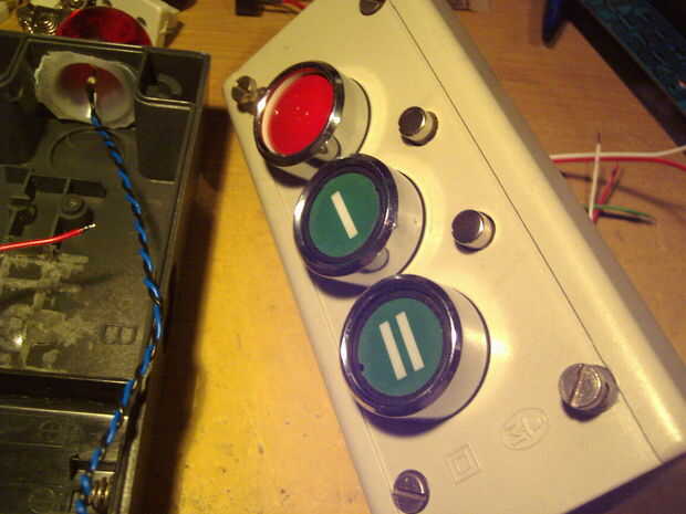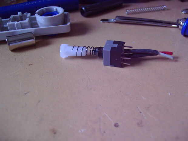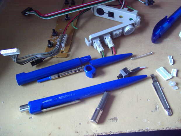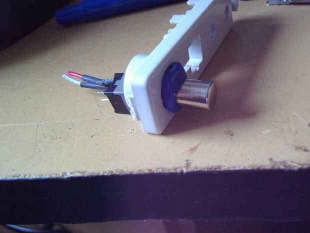 Siguiente tuve que buscar algunos mandos adecuados para los interruptores de canal personalizado. He encontrado estas dos plumas idénticas con una cabeza de aluminio perfecta. Para ampliar la parte superior del interruptor i utiliza las partes de la pluma y montar la bestia entera en el soporte plástico, que luego puede ser pegado. Luego dos agujeros perforados en la parte superior del "ladrillo" y fija los soportes con los interruptores por debajo.