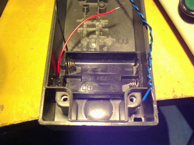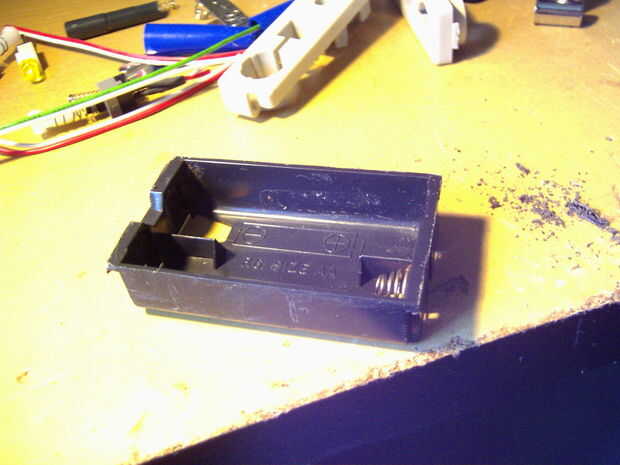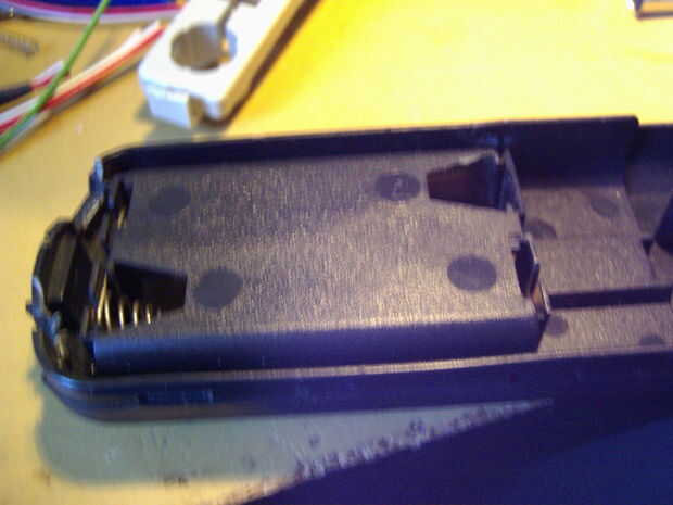 Para la cubierta de la batería reutilizar la parte posterior del mando a distancia original. Tuvo que cortar con una sierra de calar, limpiar los bordes con un papel de lija y péguelo en la parte inferior del "ladrillo".
