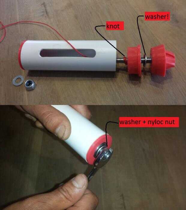 Añada una arandela M8 a la corredera en un soporte de rodamiento y el tornillo. A continuación Ate el hilo de nylon para el perno como se ve en la foto. Empuje los soportes de rodamiento en el mango de PVC y agregue una arandela y una tuerca nyloc. No apriete demasiado la tuerca, el perno debe ser capaz de girar libremente.