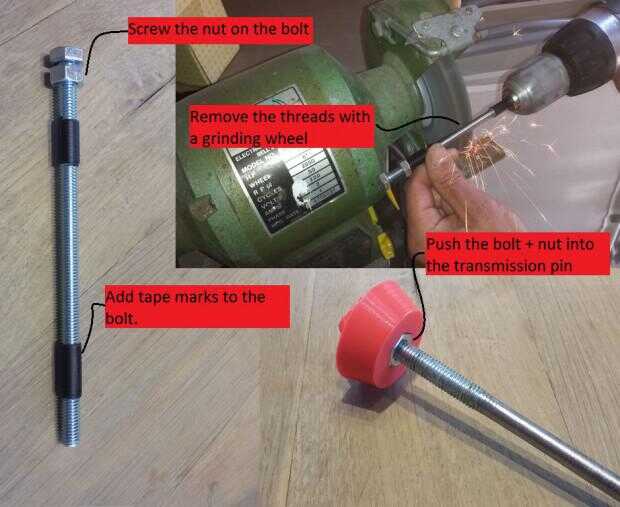 En primer lugar, atornille la tuerca en el perno. También agrega dos pedazos de cinta de la marca (parte superior: 5cm, fondo: 4cm) y la rutina de las roscas entre ellos. Usé un taladro inalámbrico y un esmeril. Si no eres capaz de conseguir una varilla lisa te sugiero añadir un trozo de tubo termo-retráctil para proteger el cordón de nylon precioso. Sin embargo rectificado de las roscas es preferido ya que también reduce un poco el diámetro (diámetro = aprovechar mejor). A continuación empuje la cabeza del perno en el pin de transmisión. Probablemente tienes que calentar con un mechero para adaptarse más fácilmente. Debe ser un ajuste apretado.
