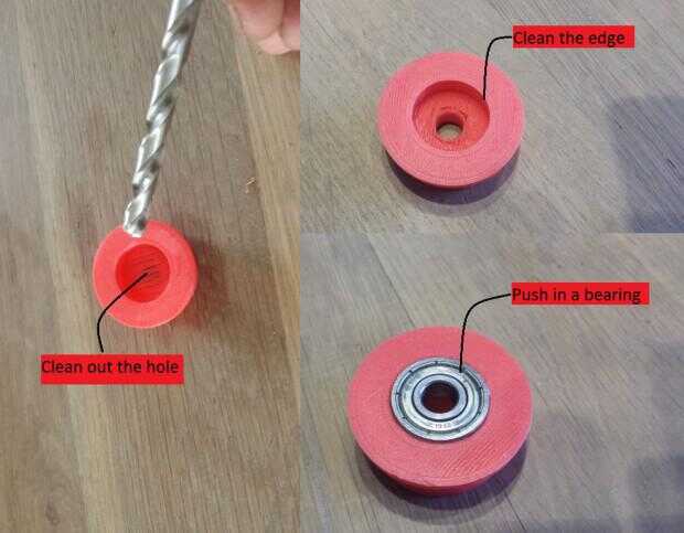 En primer lugar abrir el agujero de los soportes de cojinete. El orificio se cierra con una sola capa "puente" para evitar la necesidad de soporte material. También debe limpiar el borde con un cuchillo para que el cojinete puede montarse más fácil.