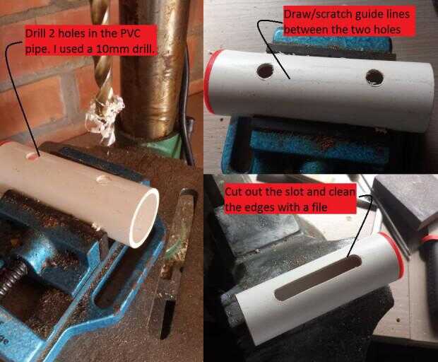 Haga dos orificios en el tubo de PVC. He marcado dos puntos 3 cm de cada extremo y perforado con una broca de 10mm. Luego necesitas cortar una ranura por los dos orificios de conexión. Usé una dremel con disco de corte para ello.