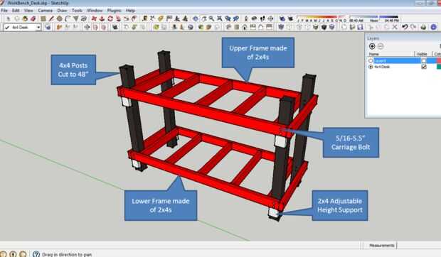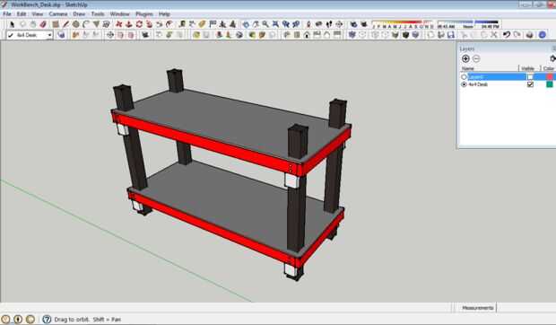 este escritorio fue construido para un frito que lo funciona y necesitaba algo robusto, pero construcción modular para permitir repetir y desgarro simple abajo/setup (para propósitos de moverse). Él se fijó en un escritorio de pie con un montón de superficie para documentos. Decidimos supsend sus monitores con el montaje original de visa que estaba utilizando. A fin de proporcionar una amplia área de escritorio y menor área de almacenamiento útil finalizado las dimensiones de la mesa como 40" x 30" x 72" de ancho profundo alto. El diseño final se compone de básicamente 3 componentes (4) patas de 4 x 4, (2) Marcos 2 x 4 y un adorno compuesto de OSB/madera. El diseño final de SketchUp se aprecia en la imagen 1. Los componentes son color cifrado para destacar la modularidad de la mesa--rojo es los estantes superior e inferior, negro es el soporte de las patas, y el gris es el acolchado (imagen 2).