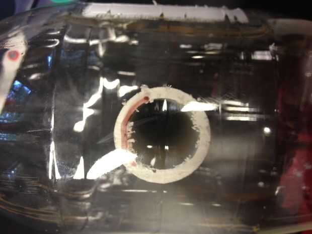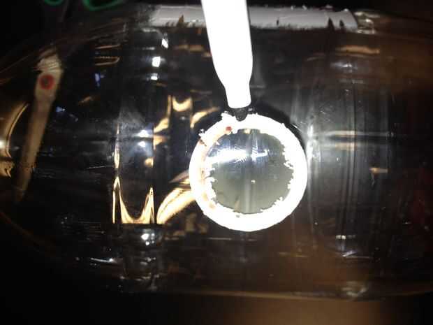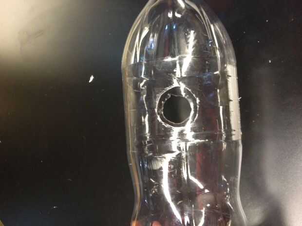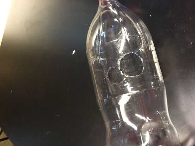Con cuchillo o tijeras, corte un 1 segundo en el agujero de diámetro de la botella exactamente enfrente del primer agujero. Repita el procedimiento en la segunda botella.
