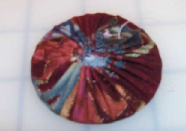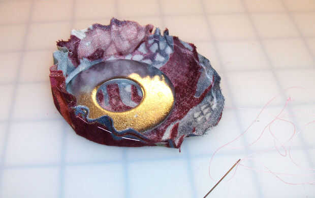 Tire del hilo hasta que el círculo comience a recoger. Coloque una o dos arandelas dentro en este momento. luego continuar a tirar del hilo hasta que la tela se recolecta para arriba, cubriendo por completo las arandelas.