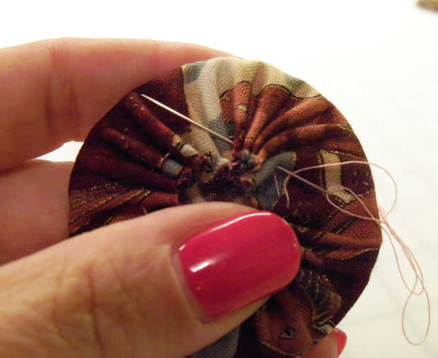 Reforzar los se reúnen por costuras alrededor del círculo otra vez, a través de la recolecta.  Una vez que usted ha estado alrededor del círculo otra vez, otro nudo y corte el exceso de hilo.