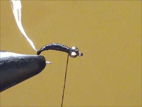 Si quieres un jején delgada puede saltar hacia adelante al próximo paso y enrolle el cable, pero quiero un cuerpo grasa midge cónico.  Envuelva el hilo hacia abajo la caña parando justo antes de donde usted atado en el cable, luego Envuelva la rosca de gancho detrás de la tira de respaldo.  Vuelva a envolver el gancho otra vez y detener justo antes donde usted terminó último el abrigo anterior y luego vuelva a enrollar hacia el talón.  Seguir haciendo esto hasta que tenga un cuerpo cónico midge grasa.